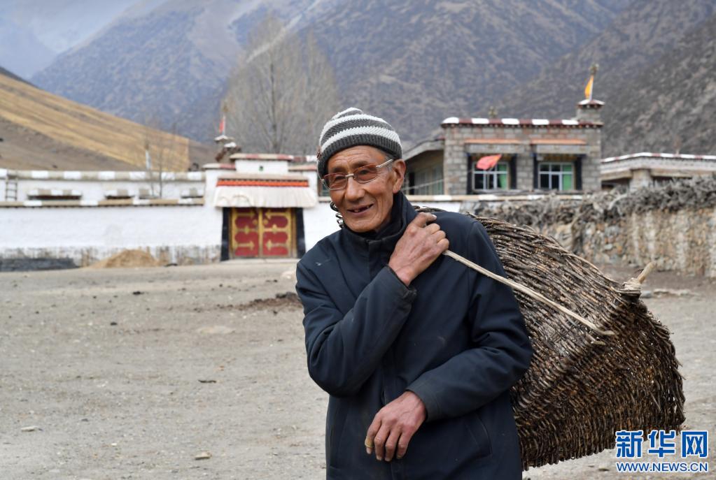 在拉薩市當雄縣寧中鄉(xiāng)麥靈村,次仁老人背著籮筐出門取干牛糞(4月16日攝)。新華社記者 覺果 攝
