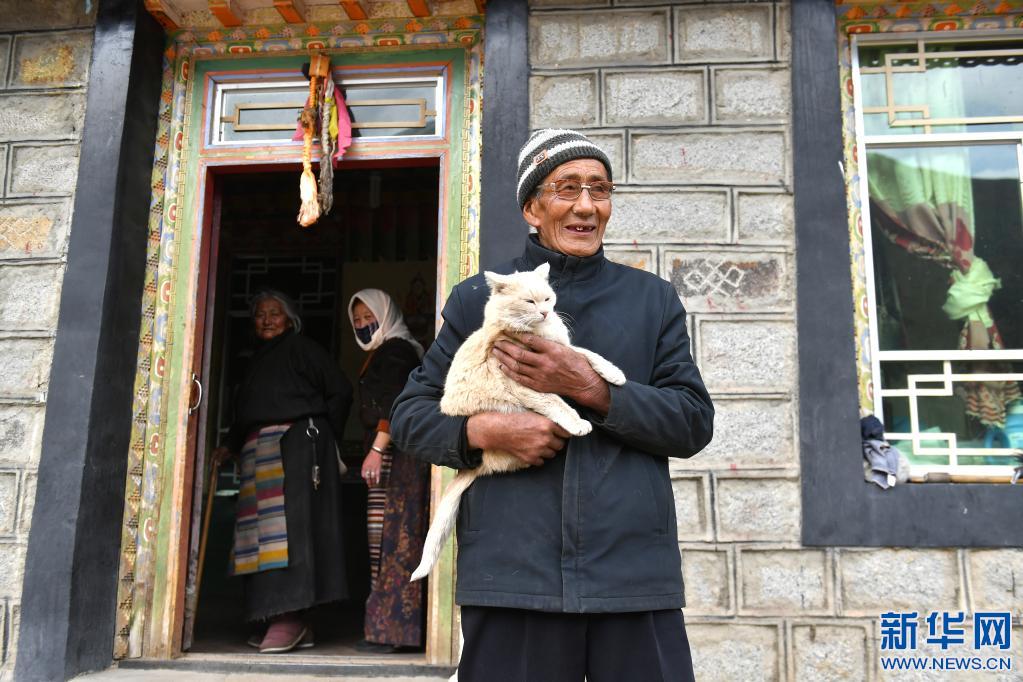 次仁老人抱著貓站在自家院中(4月16日攝)。新華社記者 孫瑞博 攝
