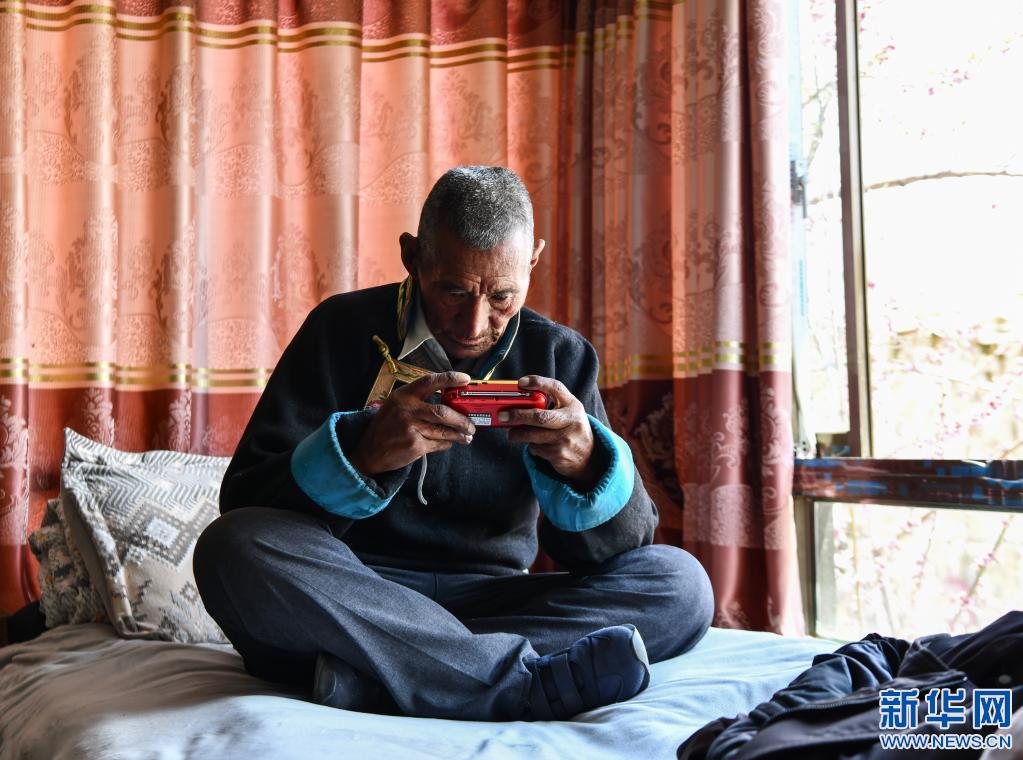拉布老人在家里收聽新聞(4月25日攝)。新華社記者 晉美多吉 攝