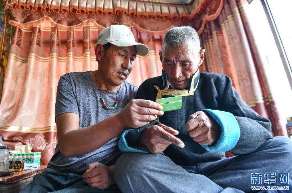 拉布的兒子(左)在向老人介紹醫(yī)??ǖ那闆r(4月25日攝)。新華社記者 晉美多吉 攝