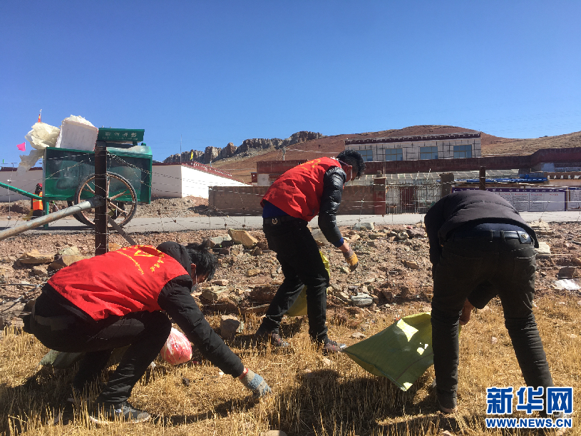 區(qū)黨校駐村工作隊(duì)組織在家牧民黨員在學(xué)校、廣場(chǎng)、村委會(huì)等場(chǎng)所集中清理生活垃圾和建筑垃圾(4月29日攝)。新華網(wǎng)發(fā) 王煦樟攝