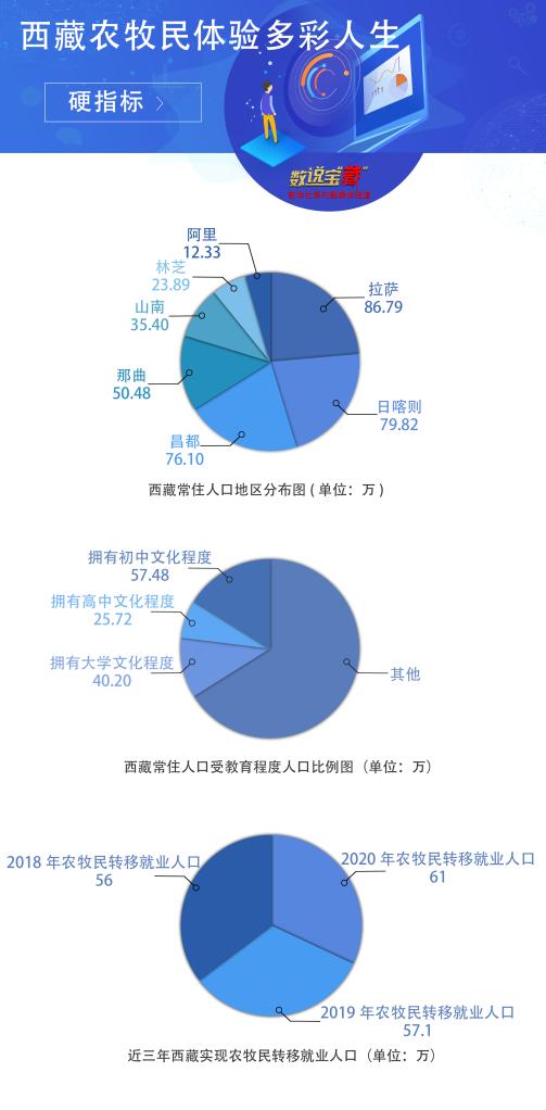 數(shù)據(jù)顯示,西藏和平解放70年來,常住人口從100多萬人增加到364.81萬人。2019年底,西藏74個貧困縣全部摘帽,62.8萬建檔立卡貧困人口全部脫貧。2020年,西藏地區(qū)生產(chǎn)總值突破1900億元,同比增長7.8%。