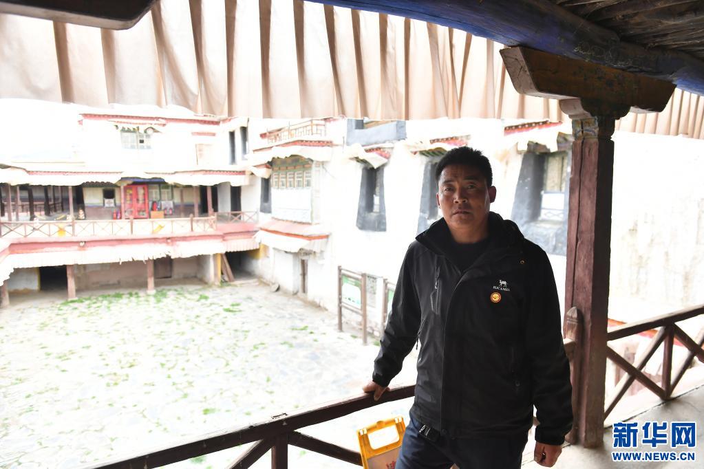 5月10日,解說(shuō)員普布次仁站在帕拉莊園二樓的走廊上。新華社記者 孫瑞博 攝