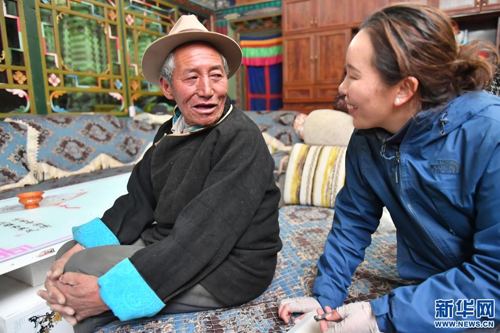 5月10日,多布杰老人(左)在江孜縣班久倫布村的家里和來(lái)訪的鄉(xiāng)干部聊天。新華社記者 孫瑞博 攝