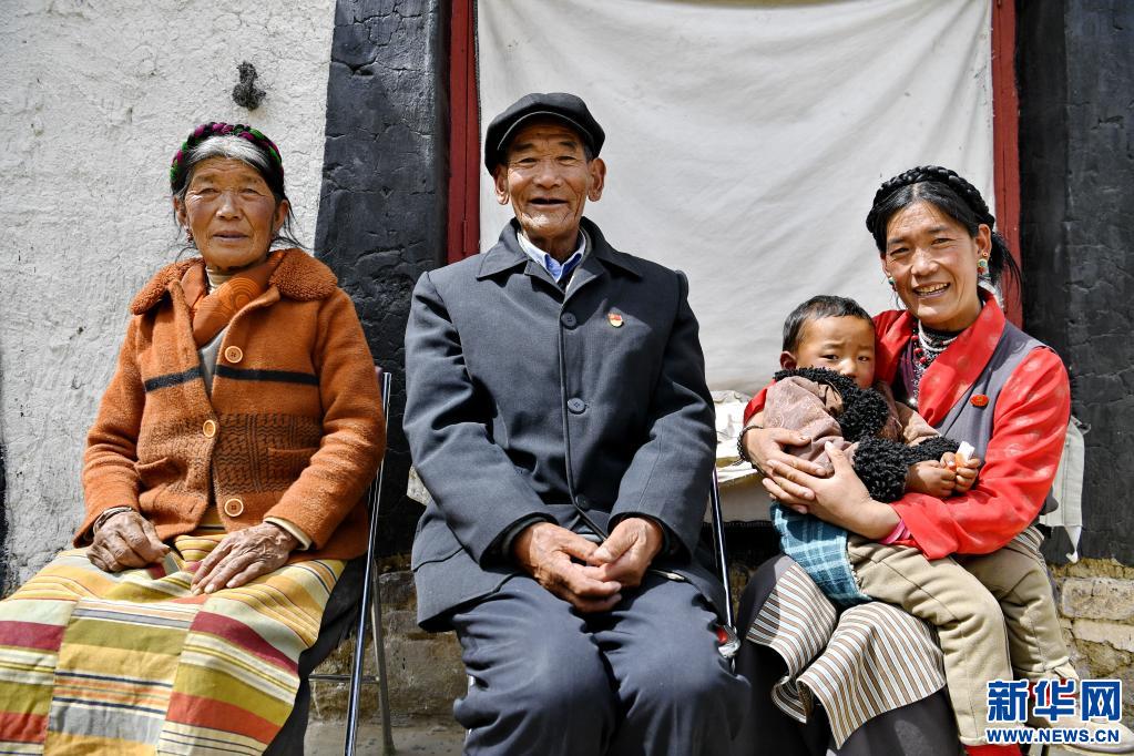 這是米瑪老人(中)與妻子窮達(左一)、小女兒德吉卓瑪(右一)以及外孫在房前合影(4月18日攝)。新華社記者 張汝鋒 攝