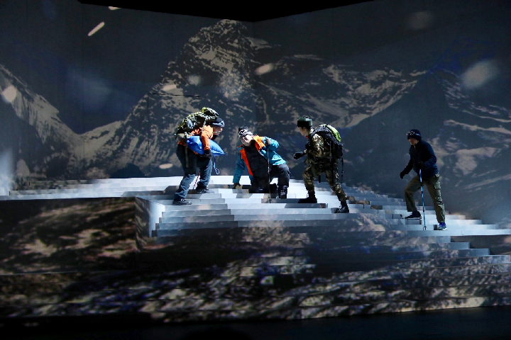 舞臺上,話劇《種子天堂》劇情進入最高潮——在缺氧、強風惡劣環(huán)境下,鐘揚拼盡氣力來到海拔6000米的高度。當他終于在一堆雜草和冰雪中發(fā)現(xiàn)那株頑強的雪蓮時,就像父親看到自己剛出生的嬰兒,臉上掛著深深的喜悅,凝望良久……