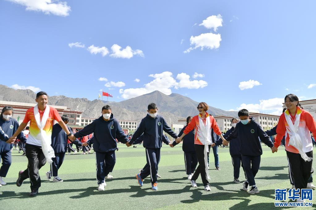 6月25日,跳水奧運(yùn)冠軍高敏(前右三),西藏和平解放以來首個(gè)競技體育世界冠軍、摔跤運(yùn)動(dòng)員西洛卓瑪(前右一)和成功登頂七大洲最高峰并徒步到達(dá)南北極點(diǎn)的西藏登山運(yùn)動(dòng)員德慶歐珠(前左一)在拉薩市阿里高級中學(xué)和學(xué)生們一起跳鍋莊課間操。新華社記者 孫瑞博 攝