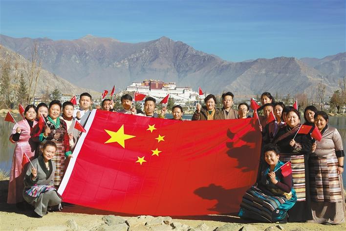 圖為西藏自治區(qū)拉薩市城關(guān)區(qū)夏薩蘇社區(qū)開展“我與國(guó)旗合個(gè)影”主題黨日活動(dòng)。