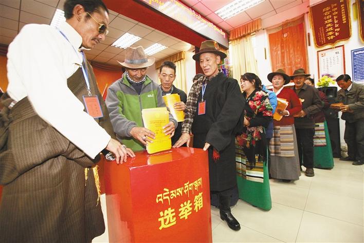 圖為西藏自治區(qū)拉薩市熱木其社區(qū)居民投票選舉。
