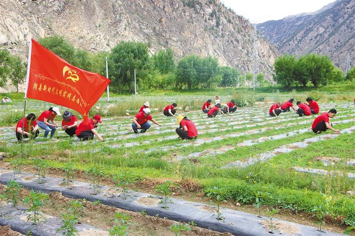 圖為西藏自治區(qū)林芝市朗縣新時(shí)代文明實(shí)踐志愿服務(wù)隊(duì)來(lái)到洞嘎鎮(zhèn)達(dá)木村,幫助當(dāng)?shù)卮迕窀赊r(nóng)活。