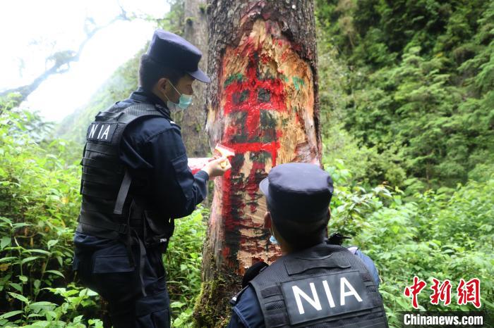圖為三安曲林邊境派出所移民管理警察在邊境山口噴繪主權(quán)標(biāo)志物。山南邊境管理支隊(duì)供圖