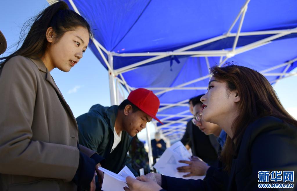 西藏的大學畢業(yè)生(左)在和就業(yè)援藏的用人單位工作人員溝通(2019年6月20日攝)。 新華社記者 張汝鋒 攝