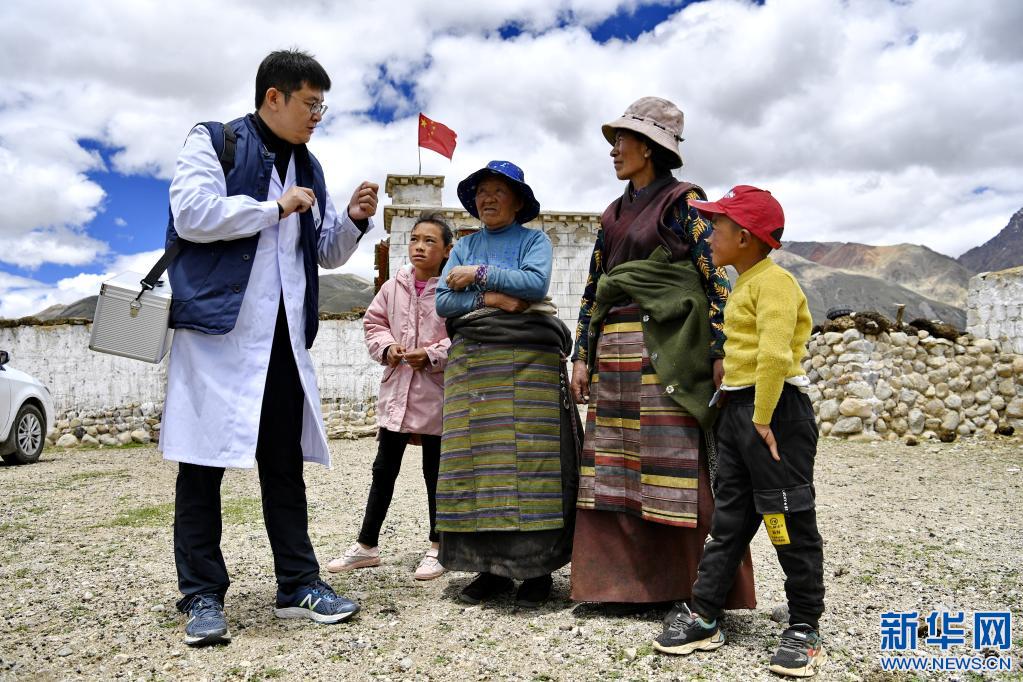 在拉薩市當(dāng)雄縣格達(dá)鄉(xiāng)格達(dá)村,前來義診的王克明(左一)為村民講解健康知識(6月19日攝)。新華社記者 張汝鋒 攝