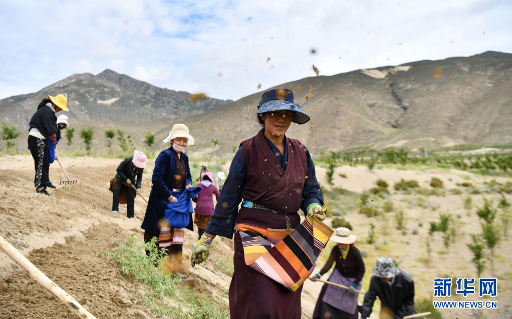 在山南市全國防沙治沙綜合示范區(qū),當?shù)厝罕娫谏车厣显苑N樹苗(7月20日攝)。新華社記者 晉美多吉 攝