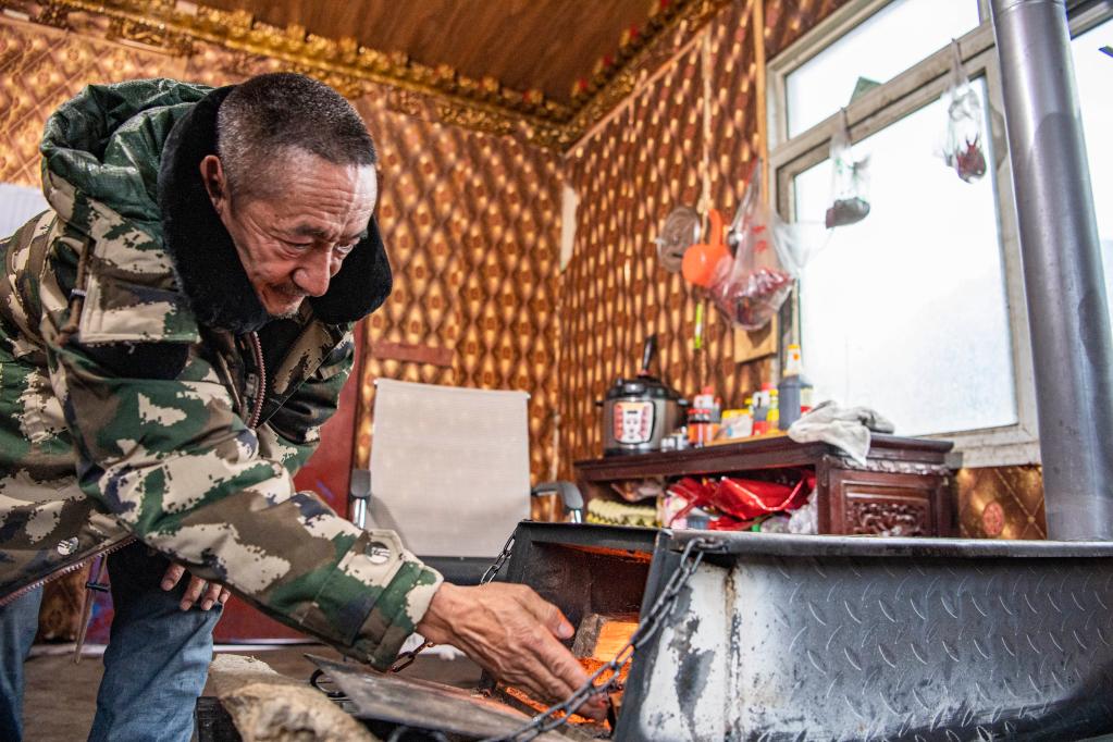 索朗次仁正在給爐子生火(4月1日攝)。新華社記者 孫非 攝
