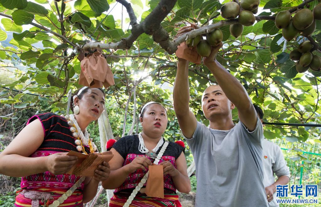 在西藏自治區(qū)林芝市察隅縣下察隅鎮(zhèn)京都村,獼猴桃園管理員高峰(右)在指導(dǎo)當(dāng)?shù)卮迕窠o獼猴桃果實(shí)套紙袋(7月22日攝)。京都村通過(guò)“公司+農(nóng)戶”模式引進(jìn)了獼猴桃種植,幫助村民增收。新華社記者 金立旺 攝