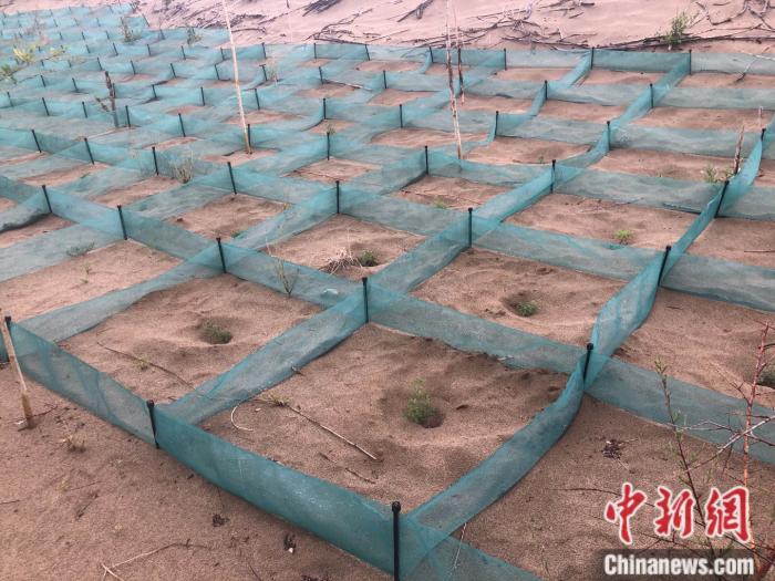 “傳統(tǒng)的方法是用廢樹枝等擺成方格等一定的形狀壓沙,里面再種上植物,效果很好但樹枝往往四五年就腐爛了;最近我們在嘗試推廣一種新型化學(xué)材料方格,成規(guī)模快,且能維持七到十年?!敝袊茖W(xué)院西北生態(tài)資源研究院研究員常學(xué)向?qū)τ浾哒f。