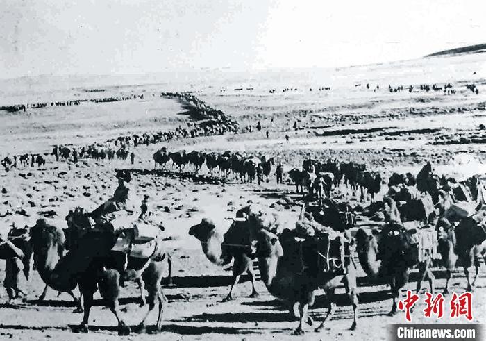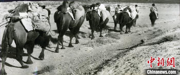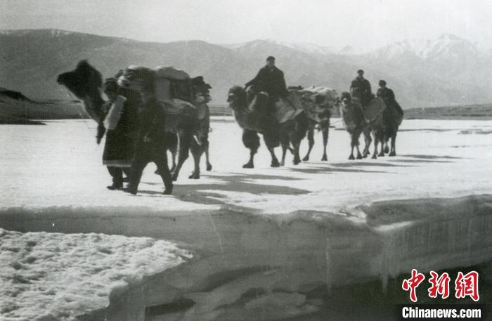 資料圖為1953年11月,西藏運輸總隊駝工往西藏徒步運輸物資。 中新社發(fā) 莫河駱駝場歷史陳列館 供圖