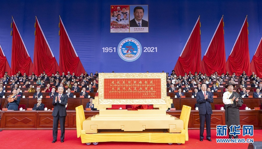 8月19日,慶祝西藏和平解放70周年大會在拉薩隆重舉行。中共中央政治局常委、全國政協(xié)主席、中央代表團團長汪洋向西藏自治區(qū)、西藏軍區(qū)、武警西藏總隊、西藏自治區(qū)政法系統(tǒng)、中國佛協(xié)西藏分會分別贈送了中共中央總書記、國家主席、中央軍委主席習近平題詞的“建設美麗幸福西藏 共圓偉大復興夢想”賀匾和賀幛。新華社記者 黃敬文 攝