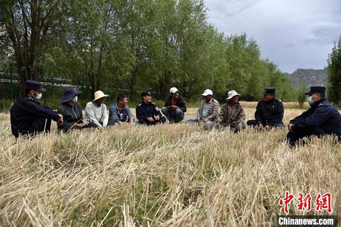 一陣忙碌過(guò)后,大家圍攏在田里聊變化說(shuō)發(fā)展。慶祝西藏和平解放70周年大會(huì)剛剛舉行,大家聊著現(xiàn)場(chǎng)觀禮、收聽(tīng)收看的感受。參加現(xiàn)場(chǎng)大會(huì)的民警高揚(yáng)向大家分享現(xiàn)場(chǎng)感受,講述自己在西藏生活學(xué)習(xí)工作22年的發(fā)展變化和入警初心。歡聲笑語(yǔ)過(guò)后,大家又忙碌起來(lái)。田間地頭藏青藍(lán)的身影,與金黃麥地構(gòu)成一幅加強(qiáng)民族團(tuán)結(jié)、警民魚(yú)水情深的動(dòng)人畫(huà)卷。