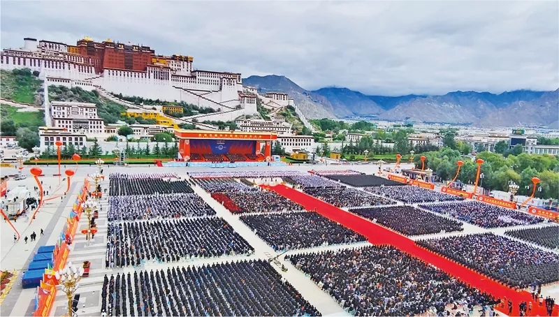 2021年8月19日,西藏各族各界干部群眾2萬(wàn)多人歡聚在拉薩布達(dá)拉宮廣場(chǎng),熱烈慶祝西藏和平解放70周年。新華社記者 孫瑞博/攝