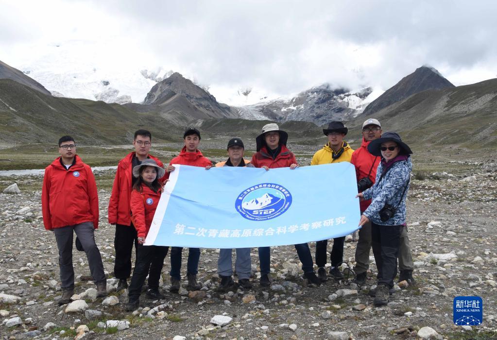 8月24日,在西藏日喀則市區(qū)域內(nèi)的喜馬拉雅山脈一處雪山下,中科院地理科學與資源研究所客座教授李渝生(中)和年輕隊員們合影。 新華社記者 杜剛 攝