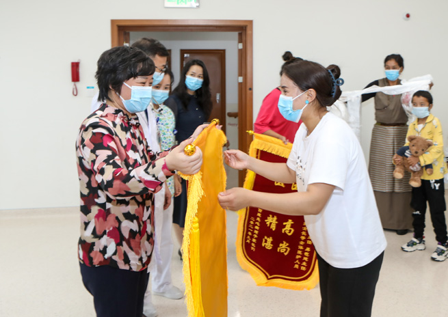 鄧?yán)蚋敝魅我恍锌赐藖?lái)渝治療的15位患兒,并為他們送上嶄新的書(shū)包和文具。并與患兒家長(zhǎng)熱情交談,詳細(xì)了解患兒恢復(fù)情況。患兒家屬代表卓瑪和旺姆分別向重慶市衛(wèi)健委和重醫(yī)附屬兒童醫(yī)院贈(zèng)送了錦旗,并獻(xiàn)上了潔白的哈達(dá)表示感謝。