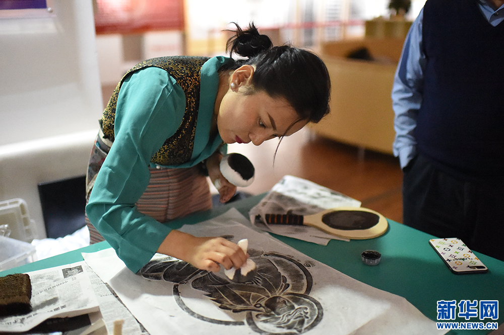 9月29日,在西藏大學(xué)新校區(qū)圖書(shū)館,日喀則石刻藝術(shù)博物館專(zhuān)業(yè)傳拓員德吉白珍演示拓片制作過(guò)程。新華網(wǎng) 旦增努布 攝