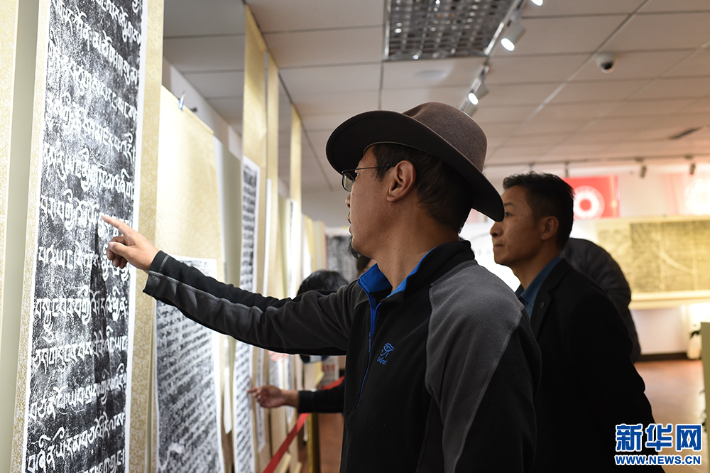 9月29日,在西藏大學(xué)新校區(qū)圖書(shū)館,參觀者觀賞石碑拓片內(nèi)容。新華網(wǎng) 旦增努布 攝