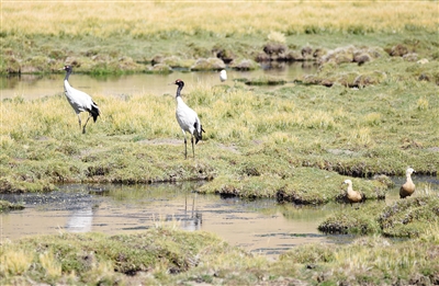 濕地上的黑頸鶴伸著長(zhǎng)長(zhǎng)的脖子優(yōu)雅地散步。