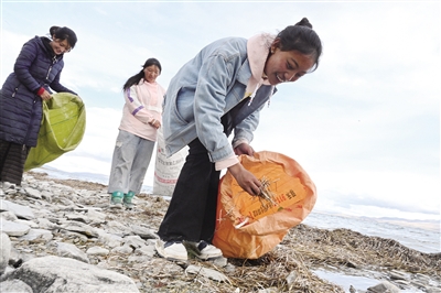 在瑪旁雍措國(guó)家級(jí)濕地自然保護(hù)區(qū)吉吾管理站,20歲的濕地保護(hù)管護(hù)員次仁旺姆和同伴在水邊撿拾垃圾。