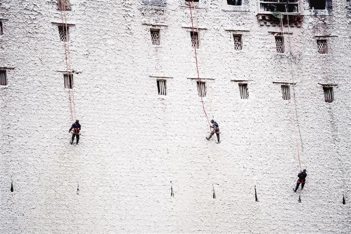 據(jù)悉,工作人員要先對(duì)涂料進(jìn)行過(guò)濾,然后再進(jìn)行噴灑。而人力無(wú)法抵達(dá)的地方則由專(zhuān)業(yè)人員化身“蜘蛛人”用涂料噴槍進(jìn)行粉刷。在高空作業(yè)的“蜘蛛人”是經(jīng)過(guò)培訓(xùn)的特定人員,“蜘蛛人”懸掉在空中,并有專(zhuān)人負(fù)責(zé)拉繩,大家齊心協(xié)力完成粉刷工作。
