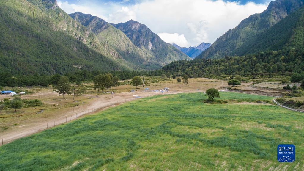 西藏林芝市米林縣,“綠哈達(dá)行動(dòng)”中種植的人工草場郁郁蔥蔥(2020年9月13日攝,無人機(jī)照片)。 新華社記者孫非 攝