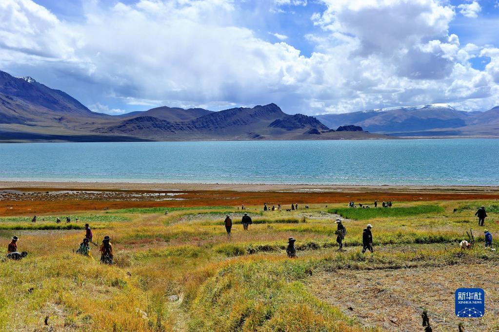 西藏尼瑪縣文部鄉(xiāng)北村村民正在人工草場收割飼草(2017年9月18日攝)。 新華社記者張汝鋒 攝