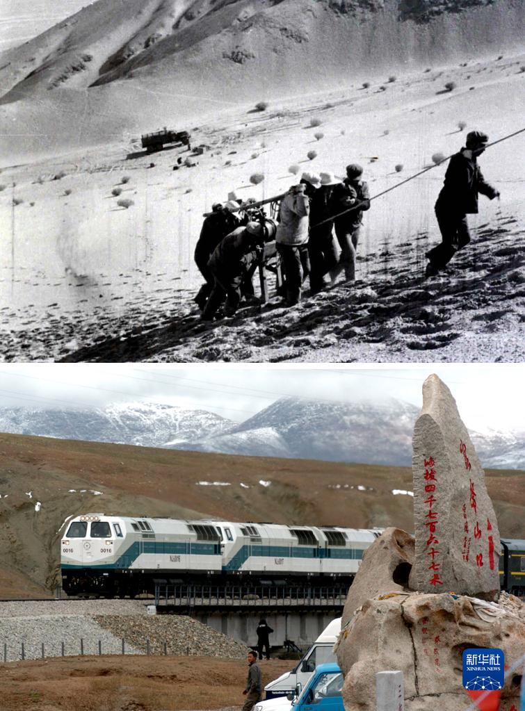 拼版照片:上圖為20世紀(jì)50年代拍攝的勘測(cè)青藏線的資料照片;下圖為2006年7月1日,青藏鐵路全線通車(chē)。這是從格爾木出發(fā)的“青1”次列車(chē)經(jīng)過(guò)海拔4767米的昆侖山口(新華社記者侯德強(qiáng)攝)。新華社發(fā)