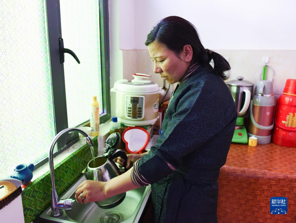 西藏山南市貢嘎縣森布日極高海拔生態(tài)搬遷安置點內(nèi),村民次仁卓嘎在家里用上了自來水。(2020年1月12日攝)。新華社記者 田金文 攝