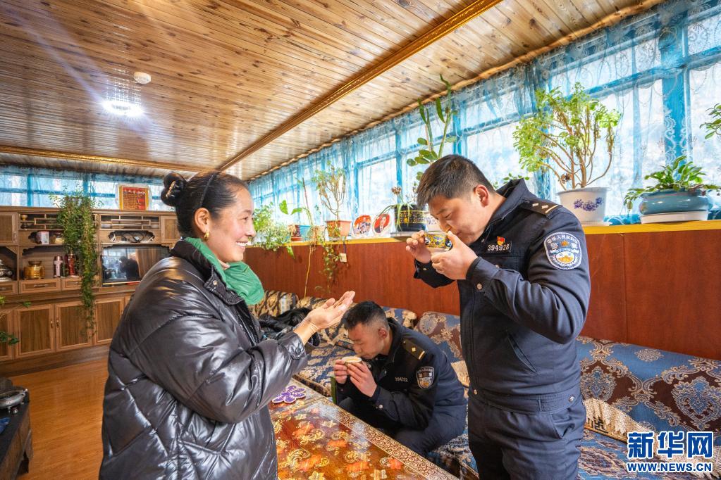 民警幫轄區(qū)群眾劈完柴火后,群眾請民警喝一杯酥油茶(12月7日攝)。新華社發(fā) (晴雯、彭維熙、劉戀報道)