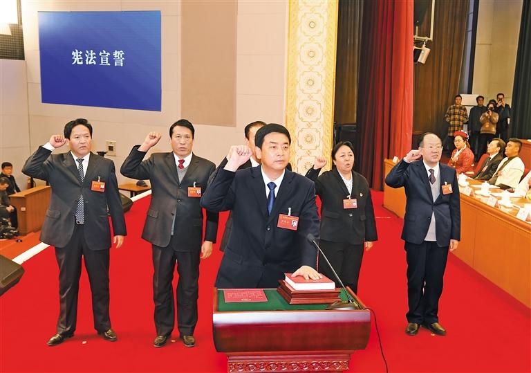 隨后,新當(dāng)選的自治區(qū)人民政府主席嚴(yán)金海,自治區(qū)第十一屆人民代表大會(huì)常務(wù)委員會(huì)副主任旦科以及委員尼瑪扎西、張莉蓉、拉巴平措、賀鵬走到宣誓臺(tái)前站立。