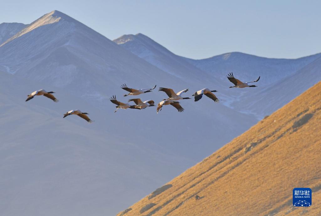 黑頸鶴在拉薩市林周縣上空飛翔(1月9日攝)。新華社記者 張汝鋒 攝