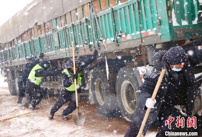 圖為2021年4月,國道109線安多段大雪致車輛通行困難,那曲市安多縣公安民警進(jìn)行除雪保通。資料圖 西藏自治區(qū)公安廳供圖