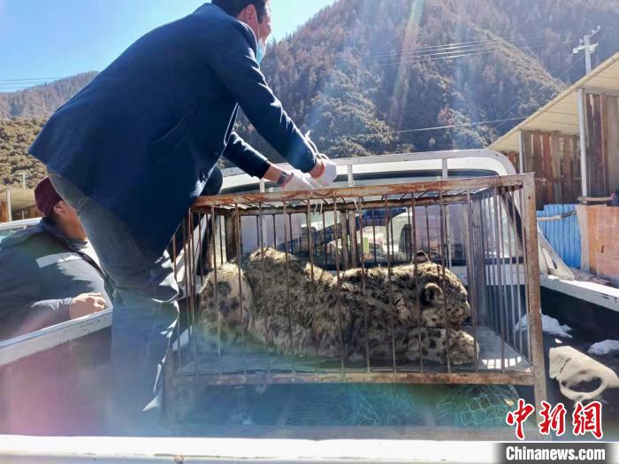 圖為工作人員將雪豹運(yùn)送至林芝市野生動(dòng)物收容救護(hù)站?!×种ナ辛植菥止﹫D