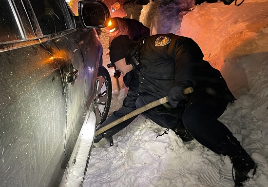 在到達現(xiàn)場后,救援民警立即為早已凍得瑟瑟發(fā)抖的被困人員送上了熱水和防寒大衣,并安撫了被困人員情緒。在勘察了現(xiàn)場的情況后,救援民警一邊用鐵鍬和雙手迅速清理車輛底盤的厚冰,一邊用牽引繩嘗試將被困車輛進行拉出,因積雪太厚嘗試多次未能成功,隨后,協(xié)調(diào)到朗縣養(yǎng)護段一輛推土機,經(jīng)過一個小時救援,被困車輛成功被拖出。被困人員救出來后,為了確保車輛人員的絕對安全,金東邊境派出所救援民警全力護送被困人員于晚上11點45分安全抵達單位營區(qū),救援工作取得圓滿成功。