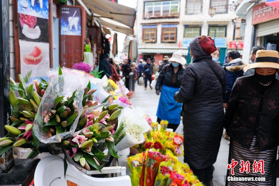 圖為拉薩沖賽康市場(chǎng)附近,銷售鮮花的攤販。江飛波 攝