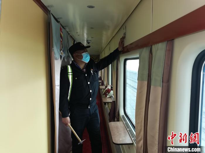 資料圖為嘎瑪達(dá)吉對列車服務(wù)設(shè)施進(jìn)行檢查。青藏集團公司供圖