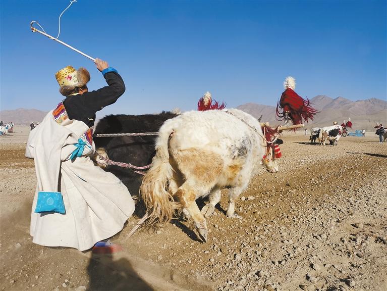 桑珠孜區(qū)曲美鄉(xiāng)拉貴村村民在揚(yáng)鞭犁地。記者 扎西頓珠 攝