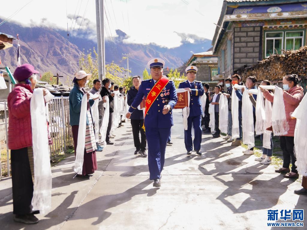 西藏林芝市朗縣洞嘎鎮(zhèn)聶村村民夾道歡迎榮立三等功的消防員洛桑頓珠(4月15日攝)。(李國燾攝 新華網(wǎng)發(fā))