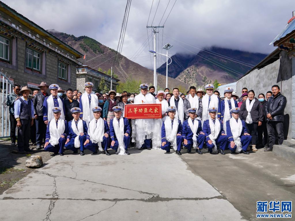 榮立三等功的消防員洛桑頓珠和隊(duì)友、鄉(xiāng)親合影留念(4月15日攝)。(李國燾攝 新華網(wǎng)發(fā))
