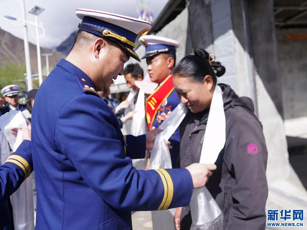 西藏林芝市森林消防支隊(duì)支隊(duì)長楊飛向洛桑頓珠家屬敬獻(xiàn)哈達(dá)(4月15日攝)。(李國燾攝 新華網(wǎng)發(fā))