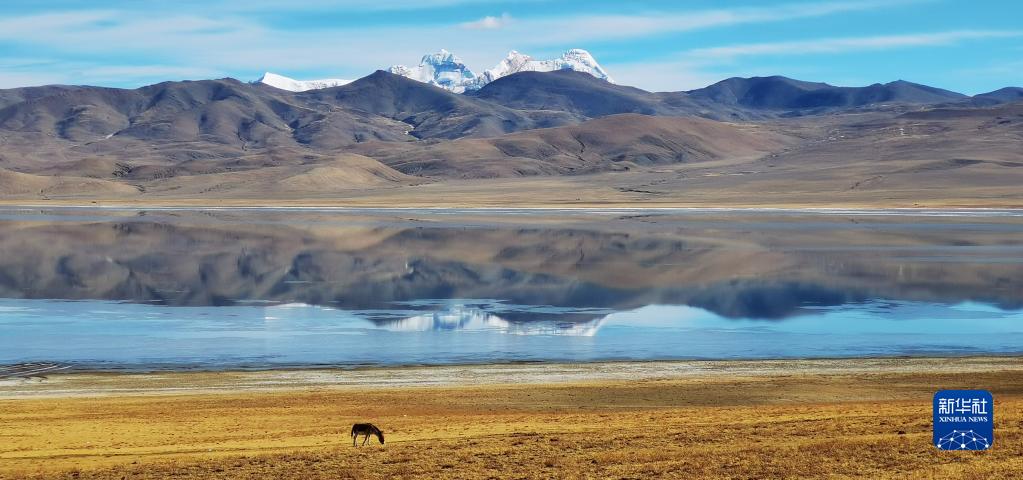 一頭藏野驢在位于西藏自治區(qū)山南市措美縣的哲古錯(cuò)旁吃草(2021年12月4日攝,手機(jī)照片)。新華社記者 沈虹冰 攝