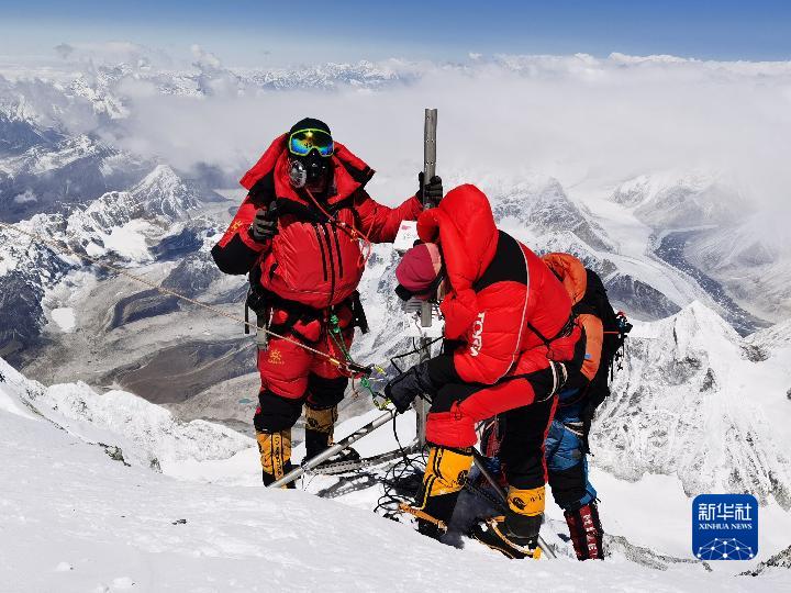 科考隊員在珠穆朗瑪峰8830米處架設氣象站(5月4日攝)。新華社特約記者 索朗多吉 攝